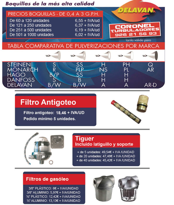 Boquillas (Nozzles): Amplia variedad de ángulos y caudales para una atomización perfecta del combustible.